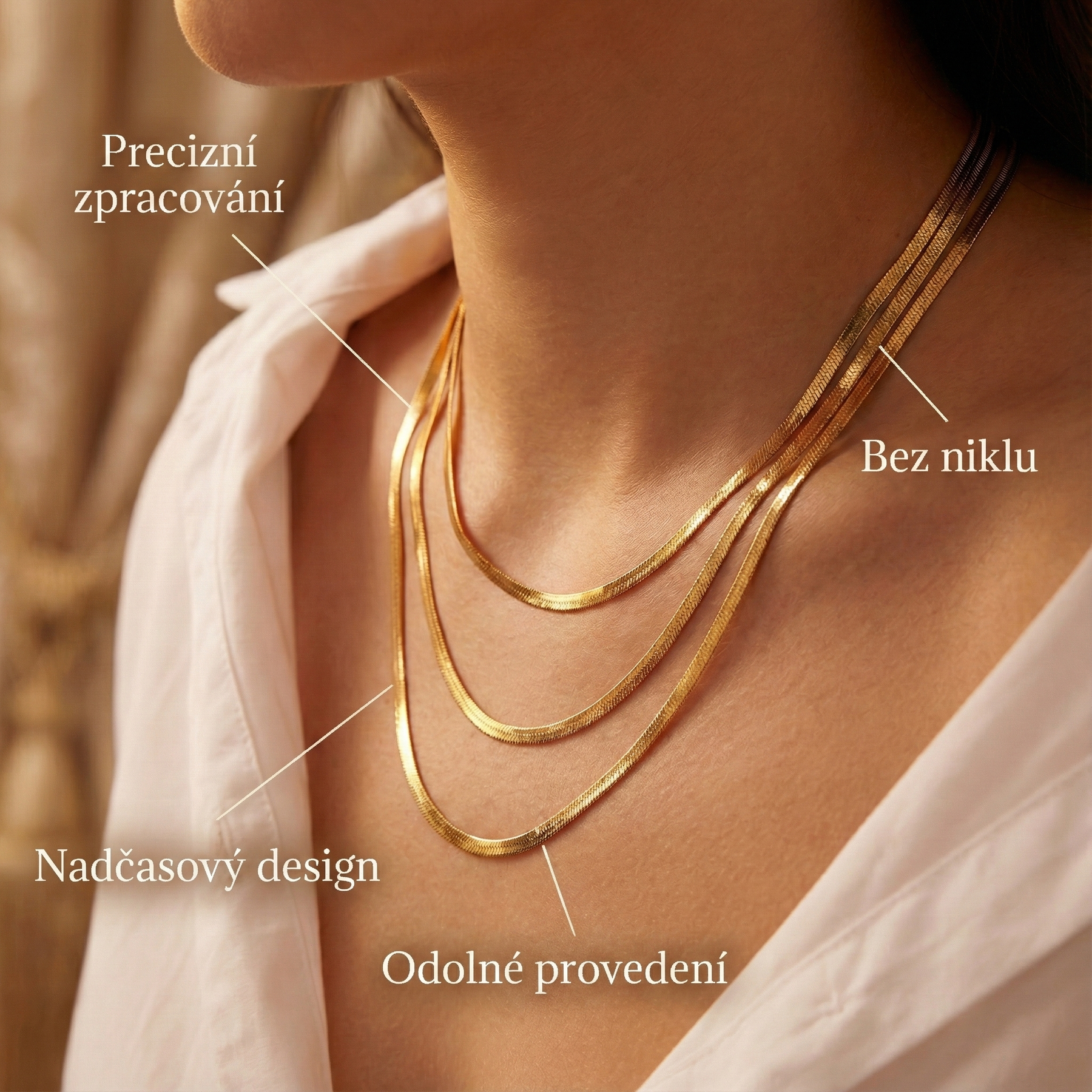 Naš nakit je otporan na znoj, vodu i toplinu, 10 puta jači od pozlaćenog. Hiperalergenski je, otporan na ogrebotine i neće potamniti – napravljen za svakodnevno nošenje, bez potrebe za dodatnom njegom.